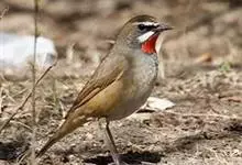 红点颏:是鸟纲、鹟科的鸣禽。又名西伯利亚歌鸲。体长14-17厘米,体重16-27克。雄鸟头部、上体主要为橄榄褐色。眉纹白色。颏部、喉部红色,周围有黑色狭纹。胸部灰色,腹部白色。雌鸟颏部、喉部不呈赤红色,…全部>>