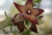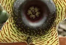 巨花犀角又称大豹皮花,是夹竹桃科犀角属的一种植物。茎粗,花大,边缘生长细毛。植株柱形多分枝呈丛生,柱形具4棱,棱缘具细小疣突。花大,五角星形黄色,并有横向棕褐色斑纹,似豹皮而得名。花期夏秋两季。…全部>>