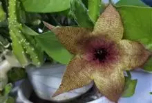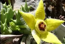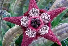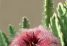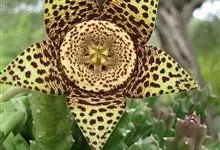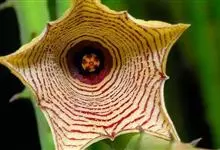 巨花犀角又称大豹皮花,是夹竹桃科犀角属的一种植物。茎粗,花大,边缘生长细毛。植株柱形多分枝呈丛生,柱形具4棱,棱缘具细小疣突。花大,五角星形黄色,并有横向棕褐色斑纹,似豹皮而得名。花期夏秋两季。…全部>>