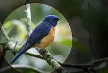 棕腹蓝仙鹟,Niltava vivida,鹟科仙鹟属的一种小型鸣禽,善在空中飞捕昆虫,中等体型18厘米,上体蓝,下体棕色,具黑色眼罩,胸橘黄渐变成臀部的皮黄色。国内分布于四川、云南、西藏和台湾等地。…全部>>