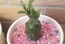 绿玉菊为菊科千里光属多年生肉质植物。植株匍匐或悬垂、向上攀援生长,茎圆柱形,红褐色,叶互生,具叶柄,肉质,很脆,易折断,叶色深绿,有浅色的脉纹,小花乳白色,有黄心。绿玉菊原产非洲南部,…全部>>