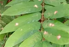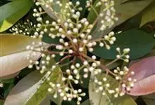 石楠 Kalkman),是蔷薇科石楠属的常绿乔木,高5~12米,株型紧凑,树冠圆球形。树枝为褐灰色;鳞片为褐色,没有毛;叶片革质,长椭圆至侧卵状椭圆形,有锯齿,新叶红色光亮。复伞房花序,白色小花,…全部>>