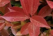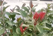 红叶石楠 是蔷薇科,石楠属杂交种,为常绿小乔木或灌木,乔木高可达5米、灌木高可达2米。叶片革质,长圆形至倒卵状、披针形,叶端渐尖,叶基楔形,叶缘有带腺的锯齿,花多而密,复伞房花序,花白色,梨果黄红色,…全部>>