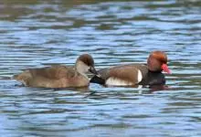 赤嘴潜鸭俗称大红头,是大型鸭类,个体比绿头鸭小,体长45-55厘米,体重1千克左右。雄鸟头浓栗色,具淡棕黄色羽冠。上体暗褐色,翼镜白色,嘴赤红色。下体黑色,两胁白色,特征极明显,野外容易辨别。…全部>>
