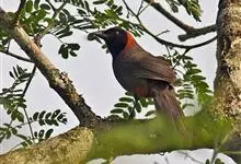 栗颈噪鹛是噪眉科、噪鹛属中型鸟类,体长22-25厘米。头顶至枕暗石板灰色,前额、头侧、颏、喉至上胸黑色,耳后至颈侧有一栗棕色块斑,在头后颈侧极为醒目。上体暗橄榄褐色,两翅黑褐色,初级飞羽外翈沾灰。…全部>>