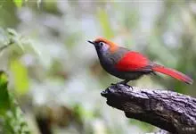 赤尾噪鹛中型鸟类,体长24~28厘米。头顶至后颈红棕色,两翅和尾鲜红色,眼先、眉纹、颊、颏和喉黑色,眼后有一灰色块斑。其余上下体羽大都暗灰或橄榄灰色。特征极明显,特别是通过鲜红色的头顶、翅和尾。…全部>>