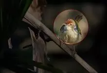 普通缝叶莺,是雀形目鹅科莺亚科缝叶莺属一种。体长10-14厘米,体重7-10克,雄鸟前额棕红,头顶至枕棕橄榄褐,上体橄榄绿染黄,飞羽及尾羽暗褐;繁殖期雄鸟的中央尾羽特形延长,下体淡皮黄白色。…全部>>