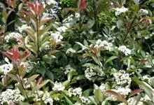 石楠 Kalkman),是蔷薇科石楠属的常绿乔木,高5~12米,株型紧凑,树冠圆球形。树枝为褐灰色;鳞片为褐色,没有毛;叶片革质,长椭圆至侧卵状椭圆形,有锯齿,新叶红色光亮。复伞房花序,白色小花,…全部>>