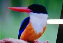 鹳嘴翡翠:体长33-37厘米。体重140-200克。共有13个亚种,体型大,嘴形巨大、侧扁,似鹳嘴,红色,嘴峰两侧有鼻沟。头灰褐色,上体蓝色,下体和宽阔的领环赭土色,脚红色。飞翔时翅上无斑。全部>>