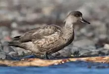 赤膀鸭,是雁形目鸭科鸭属中型游禽。雄鸟嘴黑色,脚橙黄色。头侧及头上部浅白色,满杂以褐色斑点,自嘴基经眼到耳区有一条暗褐色贯眼纹。颈部领圈棕红色,在后颈中部断开。上体暗褐色,背上部具白色波状细纹,腹白色,…全部>>
