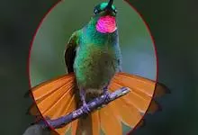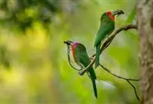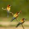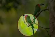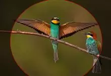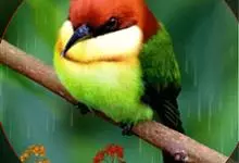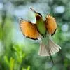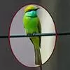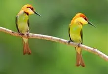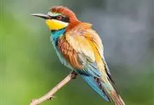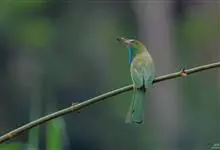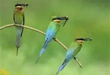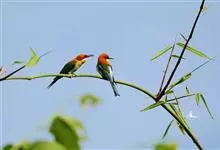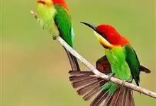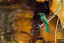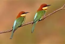 栗喉蜂虎是蜂虎科蜂虎属的鸟类。有热带鸟类羽毛艳丽的特征:喉部是栗红色的,黑色的过眼纹,翅膀和背部是绿色的,尾翼是蓝色的,飞行时翅膀下面的羽毛是橙黄色的,在阳光的照射下,它们全身闪烁着金属般的艳丽光泽,…全部>>