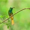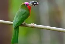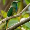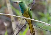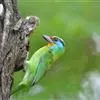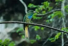 蓝须夜蜂虎是佛法僧目、蜂虎科的鸟类,体长约30厘米,是绿色林栖型蜂虎,蓝色的胸羽蓬松,嘴厚重而下弯。成鸟顶冠淡蓝,腹部棕黄带绿色纵纹。尾羽腹面黄褐。亚成鸟全身绿色。喉、胸部中央的羽甚长和亮色;该物种…全部>>