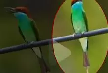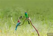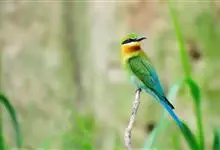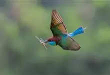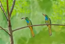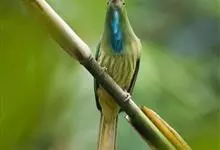 蓝喉蜂是蜂虎科蜂虎属鸟类。体长26-28厘米,嘴长而弯曲,有明显细长的中央尾羽。头部、颈部和背部为巧克力色,有黑色眼纹。喉部、腰部和尾羽为蓝色。腹部和两翼为绿色。幼鸟外观似成鸟,头部、颈部和背部为绿色,…全部>>