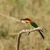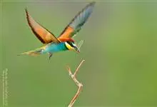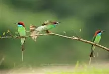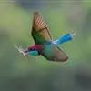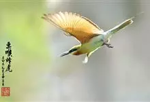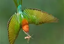 栗喉蜂虎是蜂虎科蜂虎属的鸟类。有热带鸟类羽毛艳丽的特征:喉部是栗红色的,黑色的过眼纹,翅膀和背部是绿色的,尾翼是蓝色的,飞行时翅膀下面的羽毛是橙黄色的,在阳光的照射下,它们全身闪烁着金属般的艳丽光泽,…全部>>