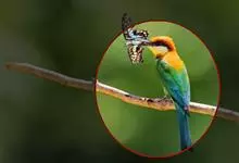 蓝喉蜂是蜂虎科蜂虎属鸟类。体长26-28厘米,嘴长而弯曲,有明显细长的中央尾羽。头部、颈部和背部为巧克力色,有黑色眼纹。喉部、腰部和尾羽为蓝色。腹部和两翼为绿色。幼鸟外观似成鸟,头部、颈部和背部为绿色,…全部>>
