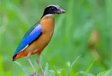 蓝八色鸫是雀形目八色鸫科的鸟类,体长约24厘米,体重109克左右。体型圆胖,尾短,腿长。羽色鲜艳,头顶两侧橘黄色的宽带延伸至颈背,宽宽的过眼纹黑色,脸颊皮黄,髭纹黑,尾亮蓝色。雌鸟较雄鸟色暗,…全部>>