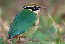 绿胸八色鸫:是雀形目八色鸫科的鸟类,共有12个亚种。体长为16-18厘米,体重65-69克。体型圆胖,尾短,腿长。头黑,上体绿色,两翼深色而具白色斑纹,头顶至后枕深褐,胸及腹部苹果绿,臀亮红。…全部>>
