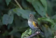 红胁蓝尾鸲俗名:蓝点冈子、蓝尾巴根子、蓝尾杰、蓝尾欧鸲。体型略小而喉白的鸲。特征为橘黄色两胁与白色腹部及臀成对比。雄鸟上体蓝色,眉纹白;亚成鸟及雌鸟褐色,尾蓝。…全部>>