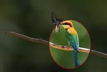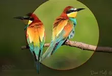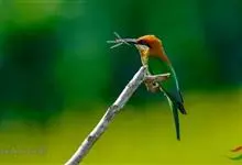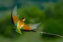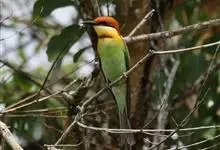 栗喉蜂虎是蜂虎科蜂虎属的鸟类。有热带鸟类羽毛艳丽的特征:喉部是栗红色的,黑色的过眼纹,翅膀和背部是绿色的,尾翼是蓝色的,飞行时翅膀下面的羽毛是橙黄色的,在阳光的照射下,它们全身闪烁着金属般的艳丽光泽,…全部>>