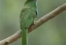 蓝须夜蜂虎是佛法僧目、蜂虎科的鸟类,体长约30厘米,是绿色林栖型蜂虎,蓝色的胸羽蓬松,嘴厚重而下弯。成鸟顶冠淡蓝,腹部棕黄带绿色纵纹。尾羽腹面黄褐。亚成鸟全身绿色。喉、胸部中央的羽甚长和亮色;该物种…全部>>