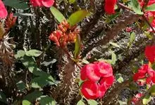 铁海棠为大戟科大戟属蔓生灌木植物;茎多分枝,具纵棱,呈旋转状;叶互生,通常集中于嫩枝上;每个花序基部边缘具微小的红色尖头;苞叶先端圆且具小尖头,无柄,上面鲜红色,下面淡红色;苞片丝状;子房光滑无毛,…全部>>
