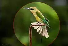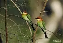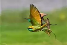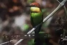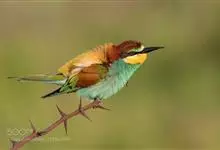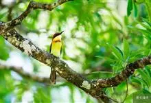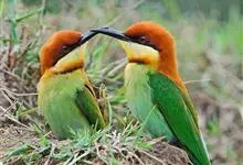 栗喉蜂虎是蜂虎科蜂虎属的鸟类。有热带鸟类羽毛艳丽的特征:喉部是栗红色的,黑色的过眼纹,翅膀和背部是绿色的,尾翼是蓝色的,飞行时翅膀下面的羽毛是橙黄色的,在阳光的照射下,它们全身闪烁着金属般的艳丽光泽,…全部>>