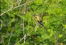 黄喉蜂虎属中型鸟类,体长23-30厘米。喉黄色,其下有一窄的黑色胸带;胸带以下的整个下体蓝绿色。前额蓝白色,具一宽的黑色贯眼纹,头顶至后颈暗栗色,尾蓝绿色,中央尾羽延长,明显突出于其他尾羽。…全部>>