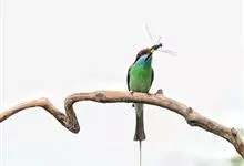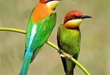 栗喉蜂虎是蜂虎科蜂虎属的鸟类。有热带鸟类羽毛艳丽的特征:喉部是栗红色的,黑色的过眼纹,翅膀和背部是绿色的,尾翼是蓝色的,飞行时翅膀下面的羽毛是橙黄色的,在阳光的照射下,它们全身闪烁着金属般的艳丽光泽,…全部>>