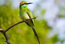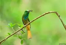 绿喉蜂虎是佛法僧目、蜂虎科的小型鸟类,共有9个亚种。身长22-25厘米,翼展29-30厘米,体重15-20克。喉绿色,额部、头顶至上背为锈红色,其余上体均为亮绿色。中央尾羽延长且端段狭细,…全部>>
