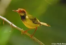 普通缝叶莺,是雀形目鹅科莺亚科缝叶莺属一种。体长10-14厘米,体重7-10克,雄鸟前额棕红,头顶至枕棕橄榄褐,上体橄榄绿染黄,飞羽及尾羽暗褐;繁殖期雄鸟的中央尾羽特形延长,下体淡皮黄白色。…全部>>