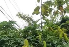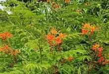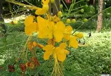 洋金凤 Sw.),豆科小凤花属灌木状或小乔木植物,枝无毛,绿或粉绿色;二回羽状复叶;总状花序伞房状,萼片无毛,花瓣橙红或黄色,圆形,花丝红色,子房无毛,花柱橙黄色;荚果窄而薄,…全部>>