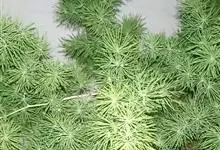 蓬莱松是天门冬科、天门冬属多年生丛生草本植物。宿存,圆柱形肉质根,纵截面为绿色和表面灰色。植株高可达3米。茎呈圆柱形或近四边形,底部木质化,具有灰色或灰褐色。幼嫩的茎在每个节上都被紫绿色鳞片包,…全部>>