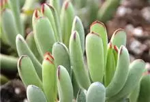 福娘为景天科银波锦属的肉质草本植物。对生的叶片呈短棒状,叶色灰绿,表覆白粉,叶缘外围镶着紫红色,叶片外形多有变化有短圆形、厚厚的方形等不同叶形;花期夏秋。福娘原产于非洲西南部的纳米比亚,…全部>>