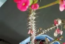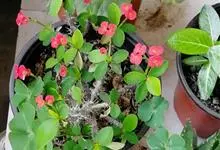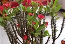 虎刺梅:别称铁海棠,是蔓生灌木植物。茎多分枝,长60-100厘米,直径5-10毫米,具纵棱,密生硬而尖的锥状刺,刺长1-1.5厘米,直径0.5-1.0 毫米,常呈3-5列排列于棱脊上,呈旋转。叶互生…全部>>