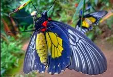 金裳凤蝶是凤蝶科、裳凤蝶属的动物。金裳凤蝶身体呈黑色,头、颈和胸侧有红毛,腹部有黑黄两色相间条纹,雄蝶前翅黑色,具黑天鹅绒光泽,各脉两侧灰白色,后翅金黄色,各室外缘有等腰三角形黑斑1枚,斑内侧有晕,…全部>>