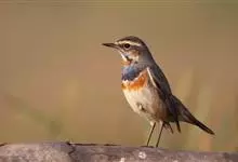 蓝点颏亦称“蓝喉歌鸲”,通称蓝靛颏儿。身体大小和麻雀相似,体长12-13厘米,体重17-18克。头部、上体主要为土褐色。眉纹白色。尾羽黑褐色,基部栗红色。颏部、喉部辉蓝色,下面有黑色横纹。下体白色。…全部>>