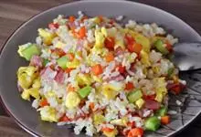 什锦炒饭是一道色香味俱全的名点,以江苏扬州的炒饭最知名。虾仁去泥肠洗净,加料酒、胡椒粉、淀粉上浆。胡萝卜洗净,切小片。蘑菇洗净、切块。将虾仁、豌豆粒、蘑菇倒入沸水锅中,焯烫至断生,捞出沥水。…全部>>