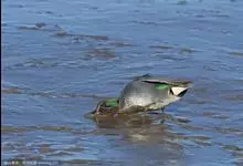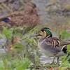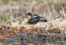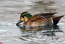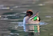 绿翅鸭是小型鸭类,体长37厘米,体重约0.5千克。嘴脚均为黑色。雄鸟头至颈部深栗色,头顶两侧从眼开始有一条宽阔的绿色带斑一直延伸至颈侧,尾下覆羽黑色,两侧各有一黄色三角形斑,在水中游泳时,极为醒目。…全部>>