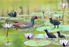 黑水鸡:是鹤形目、秧鸡科的鸟类,共有12个亚种。中型涉禽,体长24-35厘米。嘴长度适中,鼻孔狭长;头具额甲,后缘圆钝;嘴和额甲色彩鲜艳。翅圆形,第2枚初级飞羽最长,或第2枚和第3枚初级飞羽等长,…全部>>