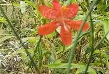 射干 Redouté)是鸢尾科射干属多年生草本植物。根状茎为不规则的块状,斜黄色或黄褐色;花橙红色,散生紫褐色的斑点;花药呈条形;子房下位,倒卵形;蒴果倒卵形或长椭圆形;种子圆球形,黑紫色,有光泽。…全部>>