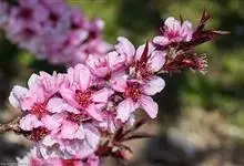 美人梅是蔷薇科李属的落叶小乔木。叶互生,呈广卵形或卵形,紫红色;花呈淡紫红色,半重瓣或重瓣,花叶同放,繁密有香味;果实呈球形,呈鲜红色;花期3-4月;果期5-6月。美人梅原产于美国,…全部>>
