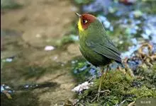 金冠地莺:形态与灰腹地莺相似,上体橄榄绿,前额至头顶渲染亮金黄色;下体几乎纯暗石板灰色,下嘴基部橙红色或橙黄色。虹膜褐色;上嘴角褐色,下嘴基部橙红色或深橙黄色直至嘴尖;跗跖和趾褐色,爪褐色。…全部>>