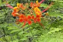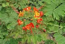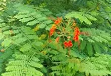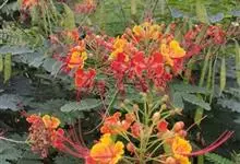 洋金凤 Sw.),豆科小凤花属灌木状或小乔木植物,枝无毛,绿或粉绿色;二回羽状复叶;总状花序伞房状,萼片无毛,花瓣橙红或黄色,圆形,花丝红色,子房无毛,花柱橙黄色;荚果窄而薄,…全部>>