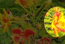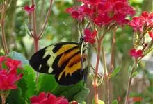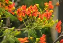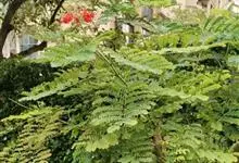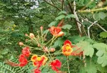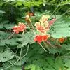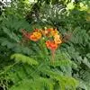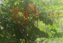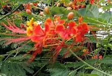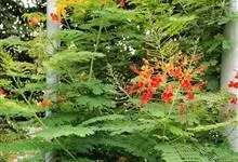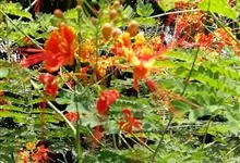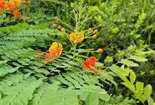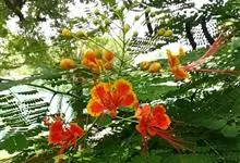 洋金凤 Sw.),豆科小凤花属灌木状或小乔木植物,枝无毛,绿或粉绿色;二回羽状复叶;总状花序伞房状,萼片无毛,花瓣橙红或黄色,圆形,花丝红色,子房无毛,花柱橙黄色;荚果窄而薄,…全部>>