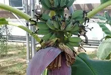 香蕉’),芭蕉科芭蕉属多年生草本植物,植株丛生,有匐匍茎;假茎浓绿有黑色斑点;叶片长圆形,上面为深绿色,无白粉,下面浅绿色;花朵为乳白色或淡紫色;果实呈弯曲的弓状,有棱,果皮为青绿色,…全部>>