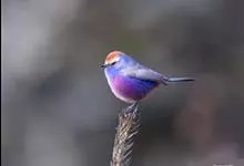 凤头雀莺:小型鸟类。体长9-10厘米,雄鸟呈毛茸茸的紫色和绛紫色,顶冠淡紫灰色,额及凤头白色,尾全蓝。雌鸟喉及上胸白,至臀部渐变成淡紫色,耳羽灰,…全部>>