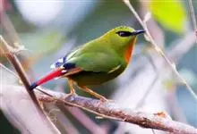 火尾绿鹛是莺科、绿鹛属小型鸟类,体长11-14厘米。上体绿色,头顶至枕具黑色鳞状斑,眼先和眼后黑色,眉纹黄绿色。两翅黑色具黄色和红色翅斑及白色端斑,极为醒目。中央一对尾羽绿色,外侧尾羽鲜红色。…全部>>