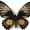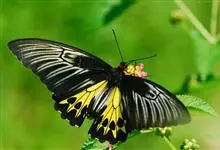 金裳凤蝶是凤蝶科、裳凤蝶属的动物。金裳凤蝶身体呈黑色,头、颈和胸侧有红毛,腹部有黑黄两色相间条纹,雄蝶前翅黑色,具黑天鹅绒光泽,各脉两侧灰白色,后翅金黄色,各室外缘有等腰三角形黑斑1枚,斑内侧有晕,…全部>>