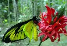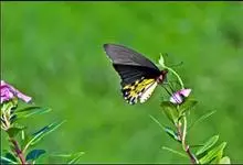 金裳凤蝶是凤蝶科、裳凤蝶属的动物。金裳凤蝶身体呈黑色,头、颈和胸侧有红毛,腹部有黑黄两色相间条纹,雄蝶前翅黑色,具黑天鹅绒光泽,各脉两侧灰白色,后翅金黄色,各室外缘有等腰三角形黑斑1枚,斑内侧有晕,…全部>>