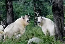 羚牛,偶蹄目牛科羚牛属哺乳动物,俗称扭角羚、野山牛、盘羊。其体形粗壮。尾短。吻鼻部隆起且裸露。前额隆起,毛短而蓬松。角基粗,由头顶长出后先向上升起,又突然翻转,靠近头部,复向外伸,然后又向后弯转,…全部>>